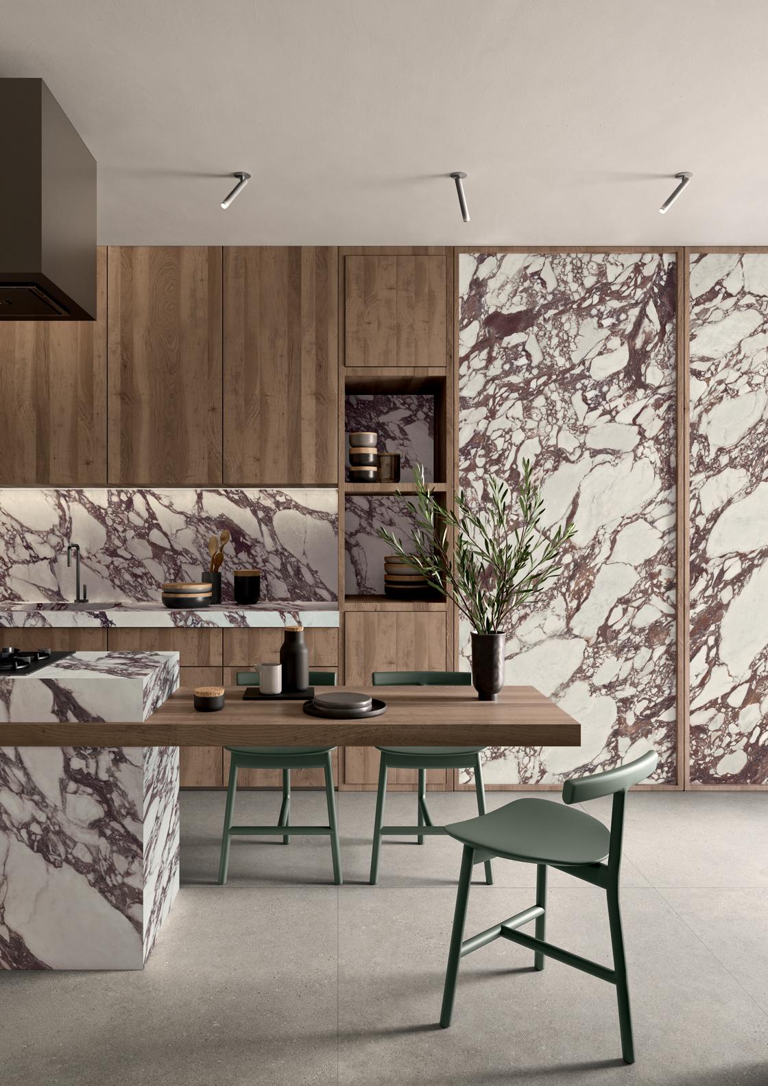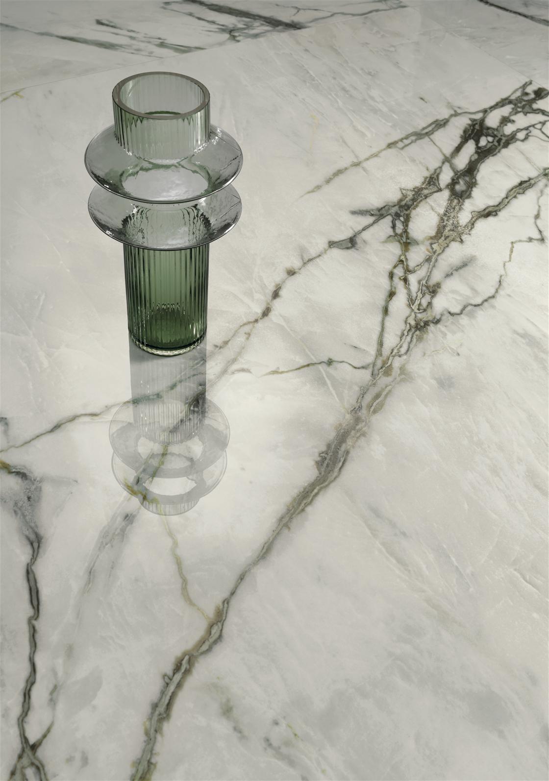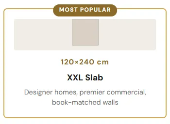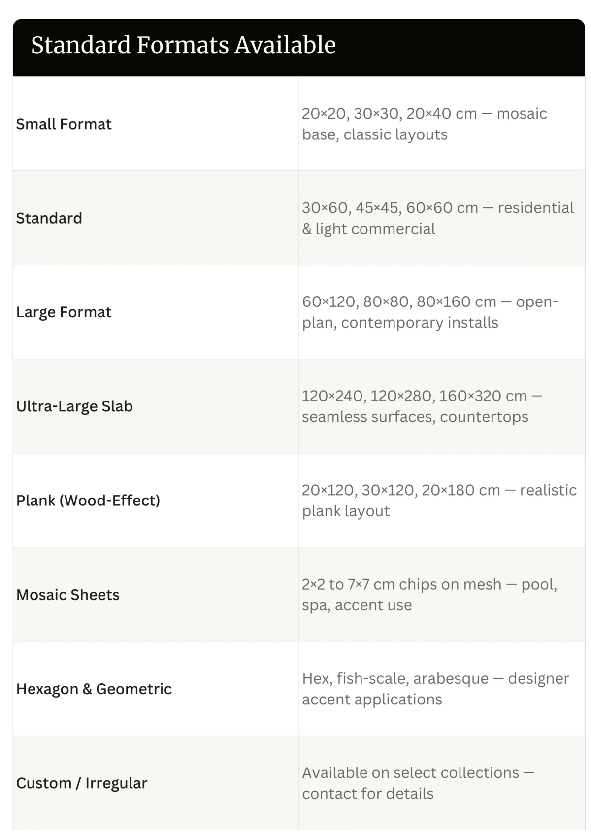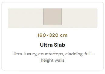 The pinnacle of Italian tile ultra-large sintered stone slabs (120×240 to 160×320cm), book-matched vein patterns, ultra-compact surfaces, and exclusive limited designer series. Used on floors, walls, and countertops in premier properties.
