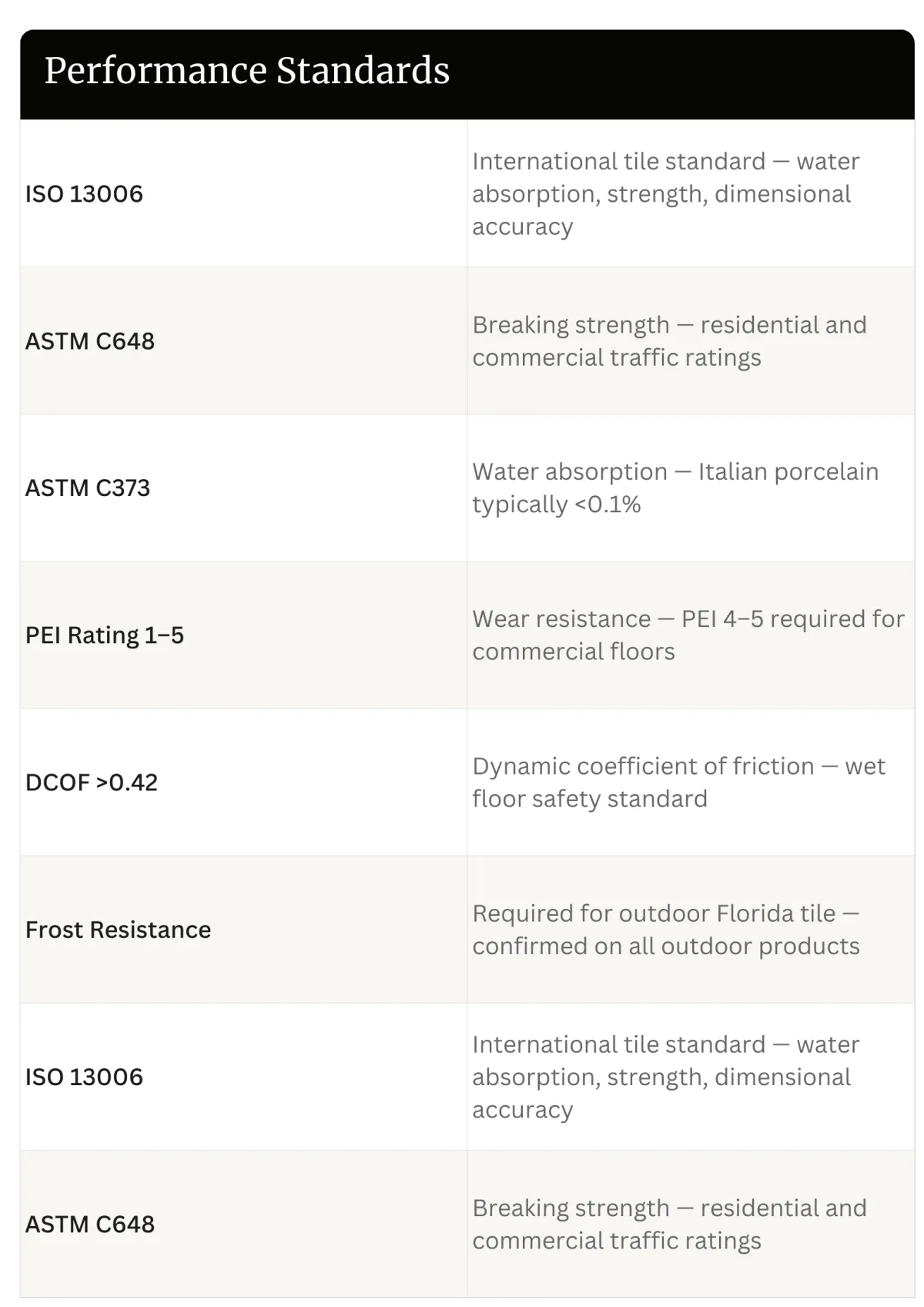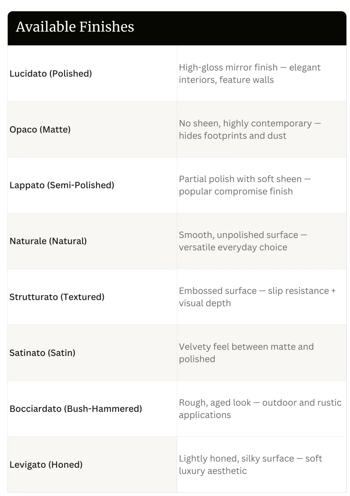 Use this quick reference when specifying Italian tile for your Florida project. Contact us for any finish or format questions.