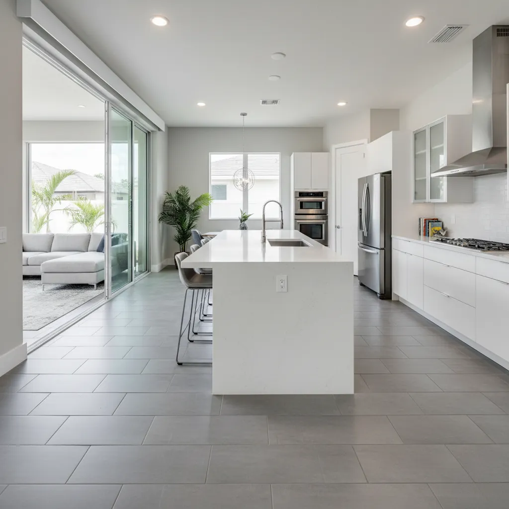 ontemporary large format porcelain tile in sophisticated gray tones delivers seamless modern kitchen floors throughout Florida homes. Matte finish provides slip resistance while 24x48 plank format minimizes grout lines for easy cleaning. Waterproof porcelain handles Florida kitchen spills, humidity, and heavy foot traffic effortlessly.