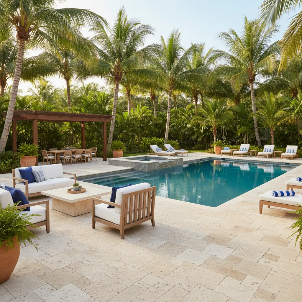 Authentic travertine natural stone remains Florida's premier pool deck material, staying naturally cool underfoot even in direct sunshine. Tumbled ivory travertine French pattern provides slip-resistant safety around wet pool areas while delivering timeless Mediterranean elegance. Perfect for Orlando, Naples, and Miami coastal outdoor living spaces.