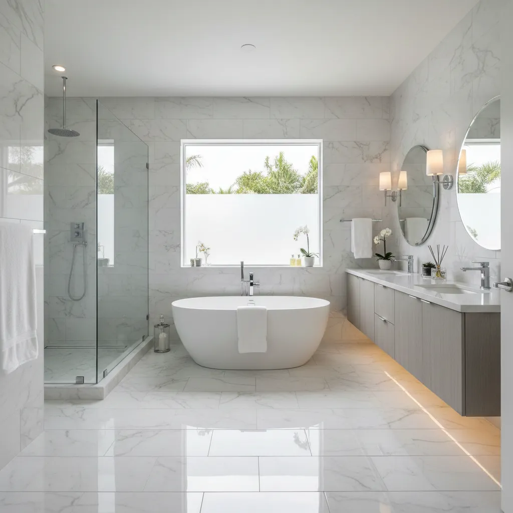 Italian-made marble-look porcelain tile replicates authentic Carrara marble with realistic veining and polished finish. Perfect for Florida luxury bathroom applications requiring waterproof performance without natural stone maintenance. Large format 12x24 tiles create seamless contemporary elegance with minimal grout lines throughout master suites.